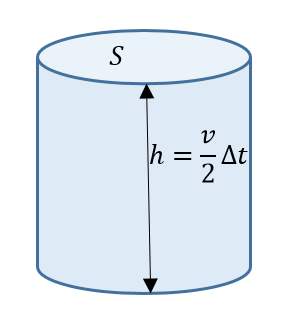 Tālāk jānosaka gaisa masa \(m\), ko laikā \(\Delta t\) propellers grūž uz leju. Zīmējumā (1. att.) ir parādīts gaisa tilpums \(V\), ko laikā \(\Delta t\) propellers rotējot grūž uz leju. Cilindra pamata laukums \(S\) ir laukums, ko aptver propellers rotējot. Pieņemot, ka gaisa kustība ir vienmērīgi paātrināta, gaisa plūsmas vidējais ātrums ir \(\frac{v}{2}\). Cilindra augstums ir vienāds \(\frac{v}{2}\Delta t\). Tad gaisa tilpumu \(V\), ko atgrūž propellers laikā \(\Delta t\) uz leju, nosaka šādi: \(\frac{v}{2}\Delta tS\). Gaisa masu \(m\) aprēķina pēc formulas \(m=\rho V=\rho \frac{v}{2}\Delta tS\), kur \(\rho\) – gaisa blīvums.