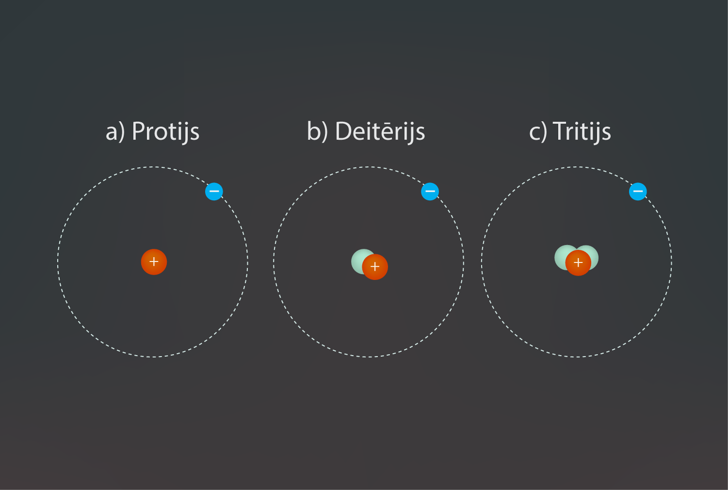 Mainot neitronu skaitu kodolā, elementa veids nemainās, bet izmaiņas kodolā notiek. Ķīmiskā elementa atomus, kuriem sakrīt kodolā esošo protonu skaits, bet atšķiras neitronu skaits, sauc par izotopiem. Piemēram, ūdeņradim ir zināmi trīs izotopi. Visizplatītākais ir ūdeņradis, kuram kodols sastāv tikai no viena protona (5. att. a). Otrs dabā sastopamais izotops ir deitērijs (5. att. b), kuram kodolā ir papildus viens neitrons. Dabā nesastopams, bet laboratorijā iegūts ir trešais ūdeņraža izotops tritijs, kuram kodols sastāv no viena protona un diviem neitroniem (5. att. c). Dažādi izotopi ķīmiskajās reakcijās uzvedas vienādi, jo elektronu apvalki neatšķiras, tādēļ tie ķīmisko elementu periodiskajā tabulā atrodas vienā lodziņā. Dažādu izotopu atšķirības izpaužas kodolreakcijās.