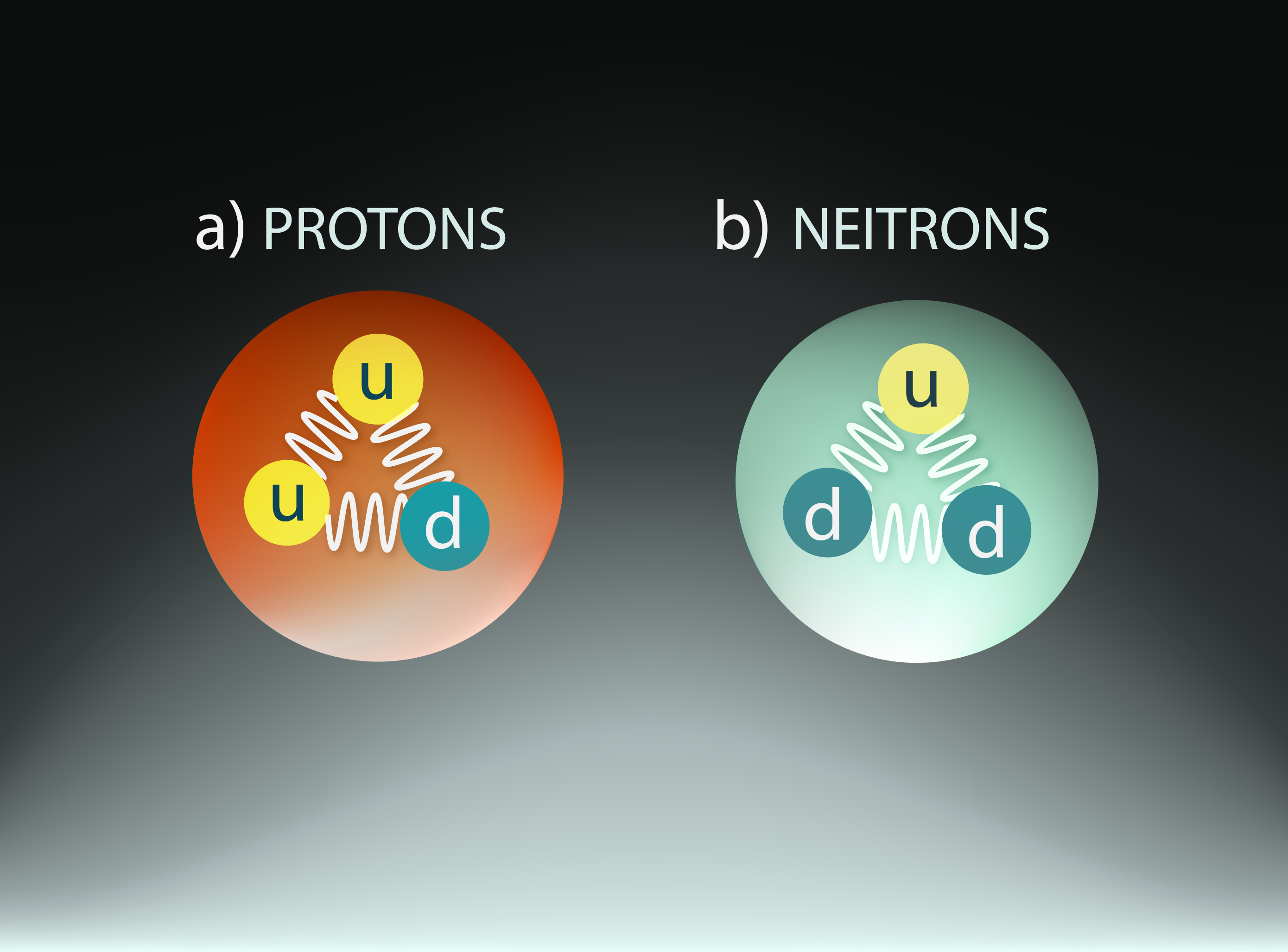 Lienot arvien dziļāk atoma un kodola uzbūvē, mēs tik un tā vēl neesam tikuši līdz pašiem mazākajiem uzbūves elementiem, jo arī protonam un neitronam ir sava iekšējā uzbūve (5. att.). Protoni un neitroni ir veidoti no elementārdaļiņām, ko sauc par kvarkiem. Pastāv sešu veidu kvarki, no kuriem nuklonos sastopami divu veidu – u un d kvarki. Protons ir veidots no diviem u kvarkiem un viena d kvarka, bet neitrons – no diviem d kvarkiem un viena u kvarka (5. att.).