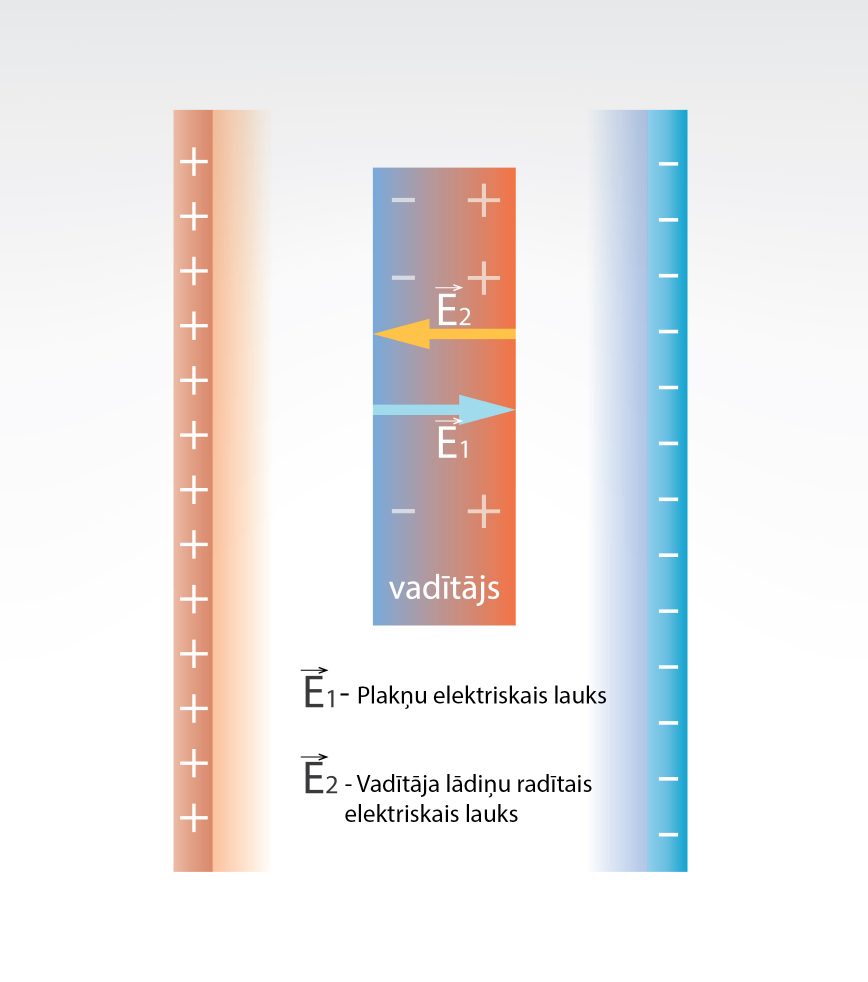 Ja starp pretēji uzlādētām plaknēm ar elektrisko lauku E1ievieto vadītāju, nevis dielektriķi, tad vadītājā notiek lādiņu pārdale, kuras rezultātā vadītājā rodas iekšējais elektriskais lauks E2, kas pilnībā kompensē ārējo elektrisko lauku E1. Līdz ar to elektriskais lauks vadītāja iekšpusē ir vienāds ar nulli.