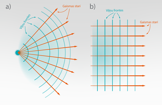Tas nozīme, ja viļņi rodas no punktveida gaismas avota, tad viļņu frontes ir koncentriski riņķi ap šo avotu un gaismas stari ir radiāli, izejoši no paša gaismas avota (7. att.). Savukārt, ja viļņu frontes ir plakanas (plakanviļņi), tad gaismas stari ir paralēli viens otram (7. att. b).