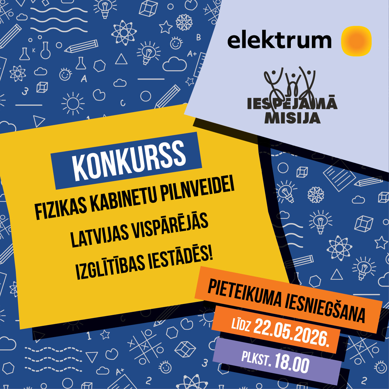 AS "Latvenergo" sadarbībā ar organizāciju "Iespējamā misija" izsludina konkursu fizikas kabinetu pilnveidei Latvijas vispārējās izglītības iestādēm. Šogad konkurss tiks organizēts divās atsevišķās daļās jeb lotēs, kopumā aprīkojot 25 Latvijas skolas. Konkursa kopējais finansējums ir 300 000 EUR. Pieteikumu iesniegšana norit līdz šī gada 22. maijam.